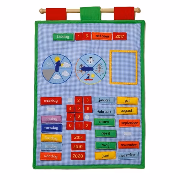 Med hjälp av den här kalendern lär sig barnet att förstå månader, veckodagar, datum och årstider. Högst upp på kalendern finns ett kardborreband där man fäster dagens datum, veckodag, månad och år. Det finns två snurror där man ställer in årstid respektive väder.