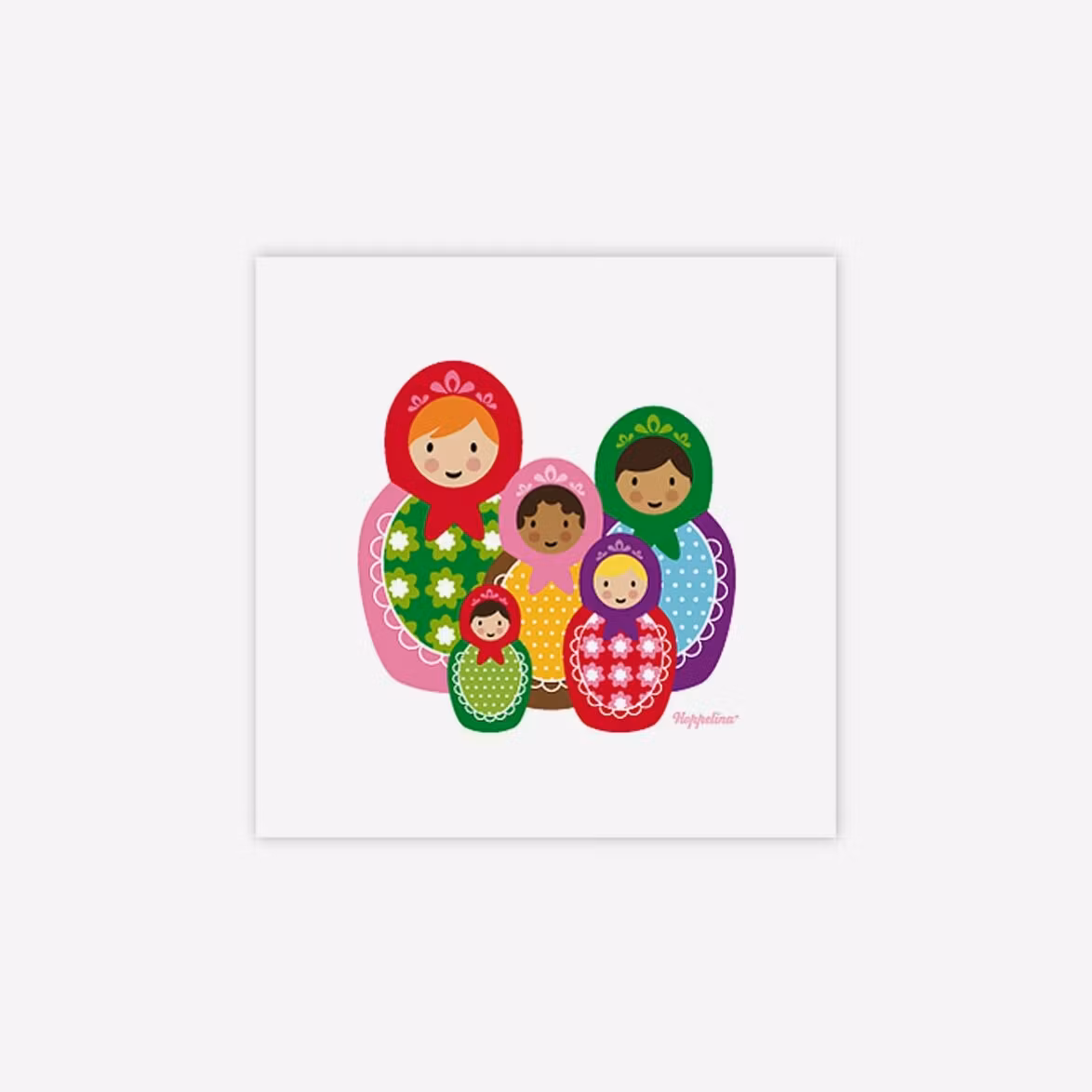 Grafiskt tryck från Hoppelina med fem färgglada ryska dockor i olika storlekar. Alla Hoppelinas produkter är tryckta på matt, kraftigt miljövänligt papper. Bilderna levereras utan ram. IKEA:s ram Ribba passar utmärkt till.
