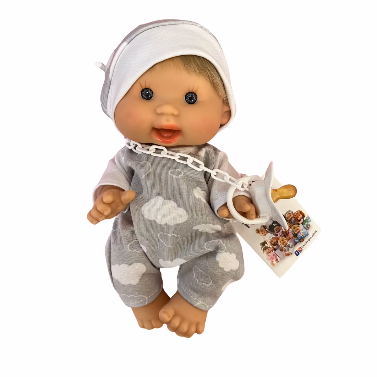 Nenotes party Pyjamas är en pojkdocka som bär en fin ljusgrå byxdress med vita moln och en vittröja. På huvudet har han en matchande nattmössa över de korta blonda håret. Hans vita napp hänger i en kedja runt halsen.