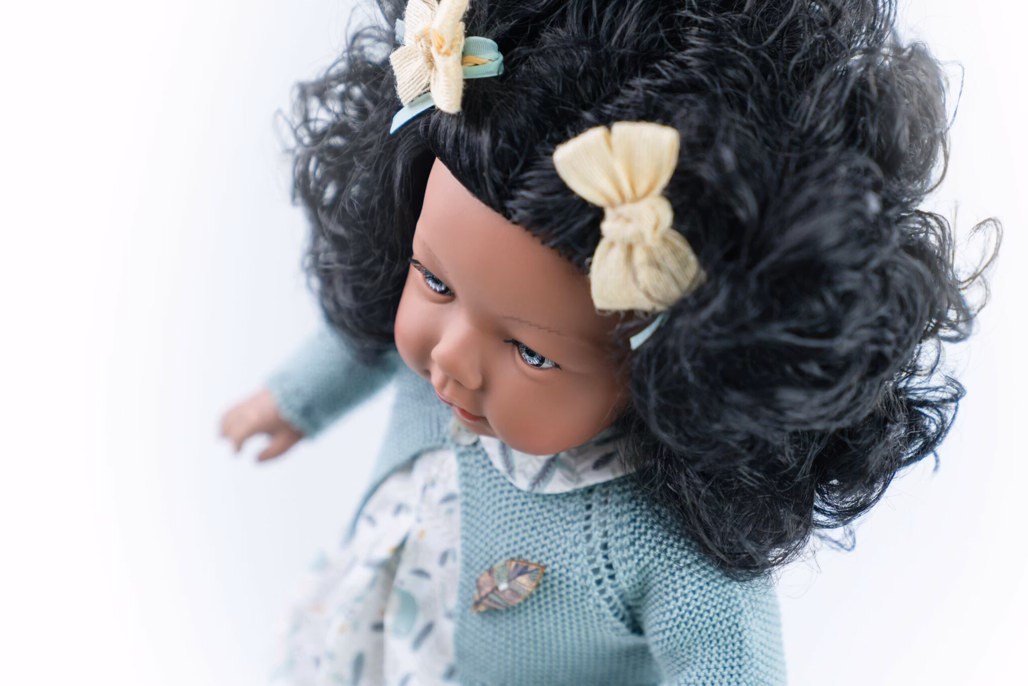 Dockan har rörliga armar och ben av vinyl och en mjuk kropp. Huvud av vinyl med klara ljusa ögon och mörk hy. Alina Forest är fint målad och ser verklighetstrogen ut. Hon har halv långt svart lockigt hår som är uppsatt med två rosetter. En magisk spansk docka. Alina Forest bär en mönstrad klänning, en grön stickad kofta och grå små sandaler. Denna docka har behandlats med naturliga oljor och doftar ljuvlig av vanilj. Dockan är ca 45cm Handmålad Fri från ftalater Rekommenderad från 3+