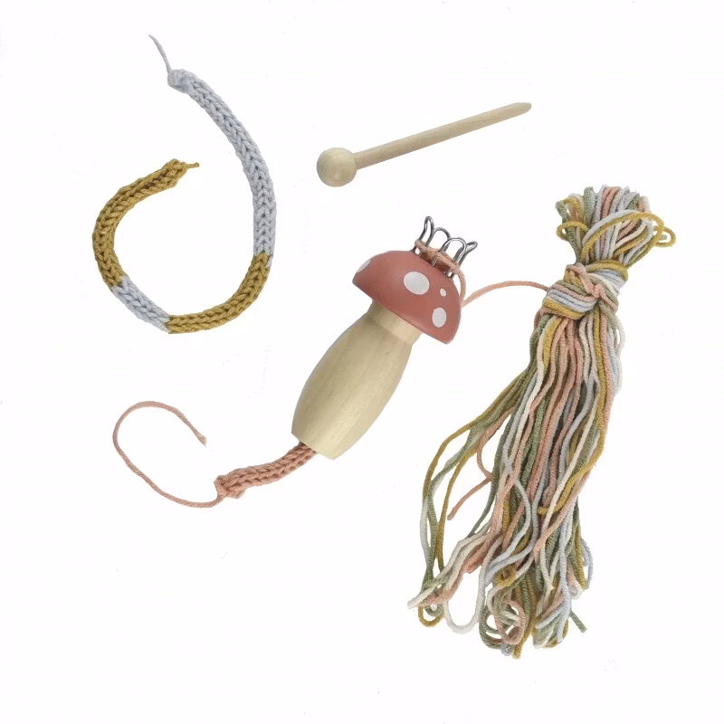Väskan innehåller 8 färger av ull, 3 träelement för att göra pompoms och en tricotin. +5 år.