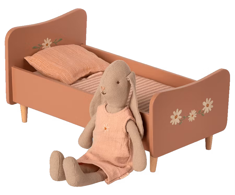 Maileg sängen har fina handmålade detaljer på båda kortändarna. Madrass, täcke och kudde medaljer så mössen och kaninerna både ligger bekvämt och håller sig varma hela natten.