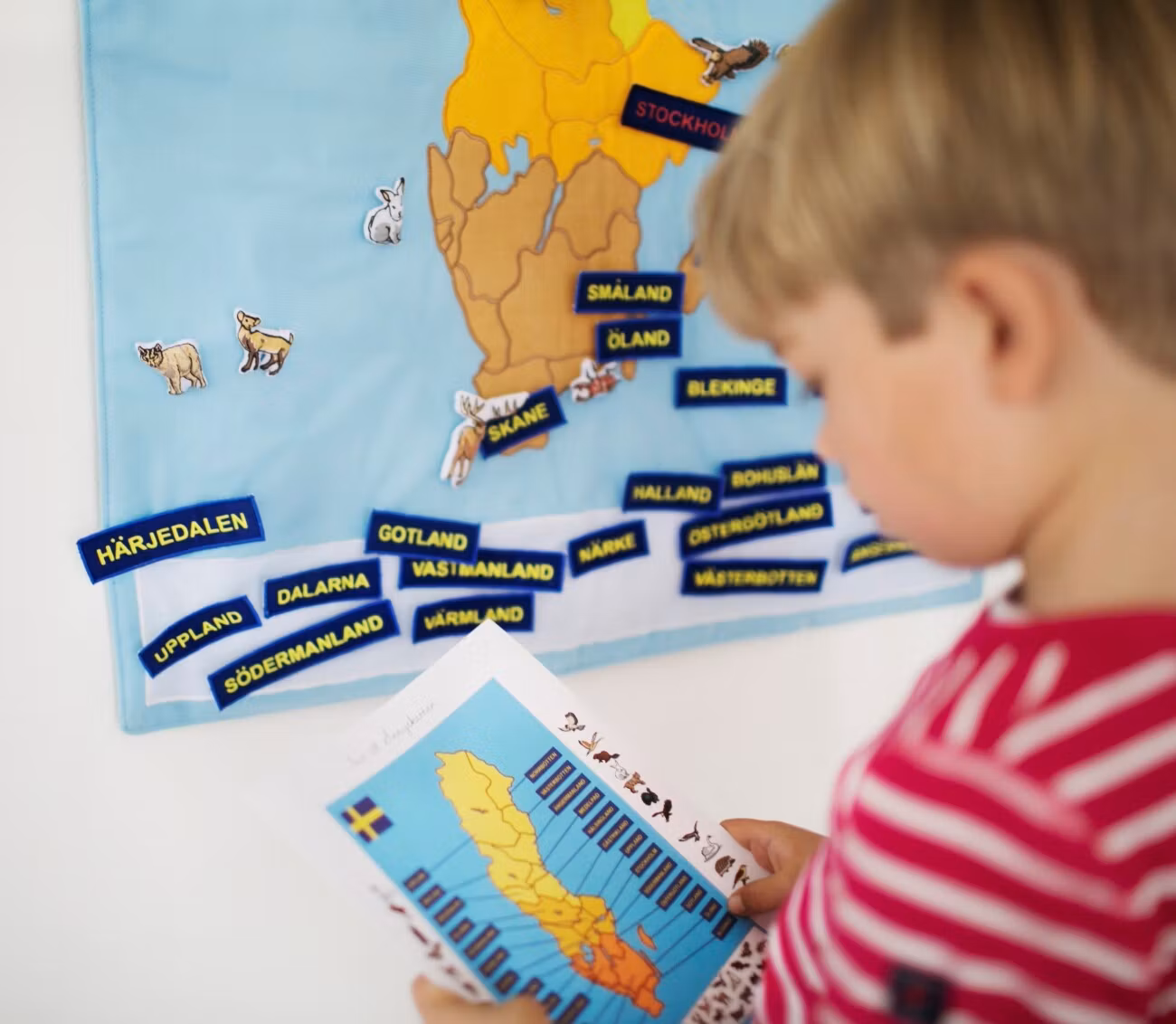 I setet så ingår karta, 26 stycken namnlappar i tyg med kardborre på baksidan (25 landskap plus 1 Stockholm huvudstad) samt 25 stycken jättefina djur.