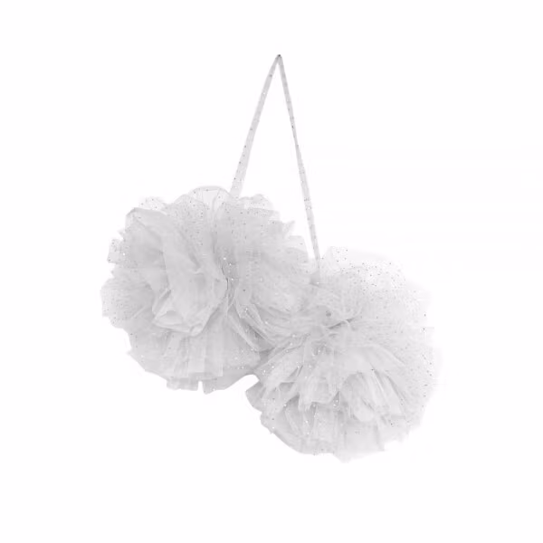 Det är så fint att dekorera barnrummet med dessa pom-poms i tunt tyg. Knyt dem som dekoration i sänghimmeln eller knyt dem och häng dem på en krok på väggen om man så vill! Bara fantasin sätter gränser. Varje boll mäter cirka 35 cm och längden på hela är cirka 130 cm. Tvättråd: Bör tvättas för hand.
